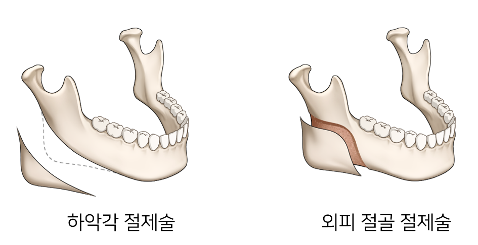 사각턱의 모양에 따라 수술법이 달라지며, 옆에서 보았을 때 튀어나온 턱뼈각을 부드럽게 다듬고, 정면 에서 보아 넓은 부분은 턱뼈의 바깥쪽 피질골을 깎아내는 외피질골 절제술을 시행합니다. 이러한 방법을 통하여 옆뿐만 아니라 정면에서 바라본 얼굴의 모습을 갸름하게 만들어 줍니다.