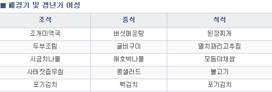 여성호르몬(estrogen)은  칼슘 흡수를 촉진하고 혈액 내 콜레스테롤의 양을 감소시키는 효과가 있으나 폐경기 이후엔 여성호르몬의 감소로 골다공증이 남성에 비해 현격히 증가하게 되고 혈관의 탄력과 심장질환 보호효과를 잃게 되어 심혈관계 질환의 위험도가 폐경 전에 비해 많이 증가하므로 골다공증과 심혈관계 질환을 예방하는 식사요법이 필요합니다.