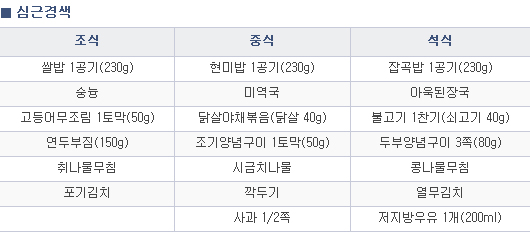 1. 밥은 현미, 보리 등을 섞은 잡곡밥이 좋으며 기호에 따라 적정량 혼식합니다. 단, 입맛에 맞지 않을 경우 무리하게 잡곡밥을 고집하지 말고 쌀밥을 섭취합니다.